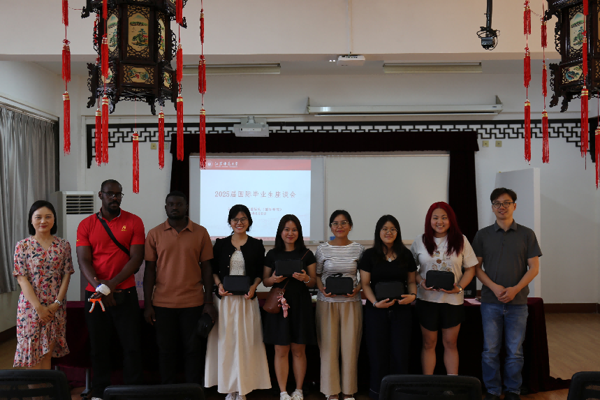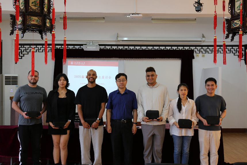6月6日,国际学院举行2025届国际学生毕业生座谈会。国际处(国际学院)直属党支部书记张蓊荟、副书记任欢欢、副院长缪小青与来自各学院的12名国际学生毕业生代表座谈交流,共同回顾成长历程、畅谈未来愿景、送上毕业祝福。副院长缪小青主持座谈会。