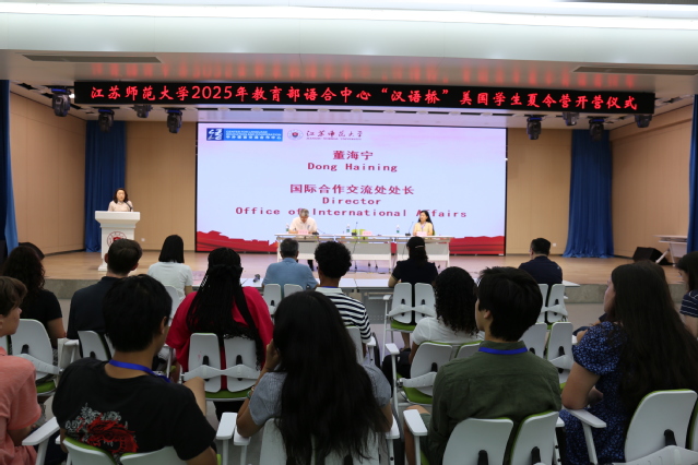 董海宁代表学校对来自美国的师生们表示热烈欢迎,并向营员们介绍了徐州的历史、江苏师范大学的概况以及我校在国际交流合作方面的情况。她指出,尽管中美两国地理上相隔遥远,但友谊的纽带却跨越千山万水,紧密相连。希望通过本次夏令营,让“汉语桥”真正成为文化之桥、友谊之桥、心灵之桥,增进同学们对中国的了解、对江苏的感情,以及对江苏师范大学的认识,使同学们成为促进中外文化交流的桥梁和使者。