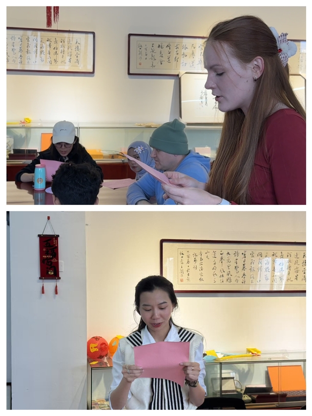 活动现场,留学生们以声传情,以文会友,用真挚而生动的朗诵传递出对中华文化的理解与热爱。来自越南的丁氏惠深情演绎《乡愁》,将诗中的家国情怀与自身对故土的思念相融合;俄罗斯学生叶亚娜则以清晰流畅的汉语诵读《春》,展现出对汉语韵律之美的准确把握。现场互动环节,同学们围绕经典篇目的文化内涵展开热烈讨论,从“明月光”到“润物细无声”,在跨文化的对话中深化了对中国文学意境与哲学思想的理解与认同。