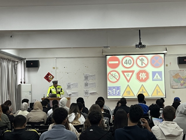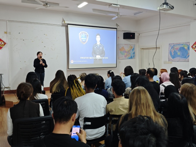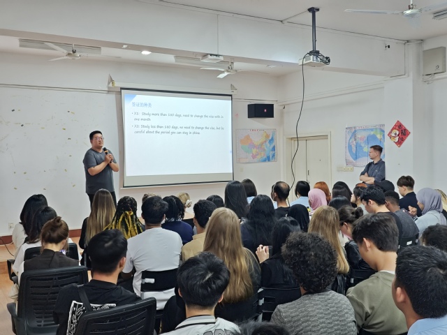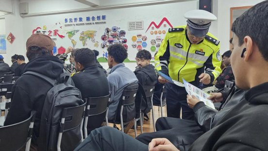 出入境管理支队王成警官围绕《中华人民共和国出境入境管理法》,系统讲解外国人入境出境流程、签证申请流程、临时住宿登记规范及人身财产安全保护知识,重点强调“合法居留是保障学业的前提”,提醒学生密切关注签证有效期,及时办理相关手续。
