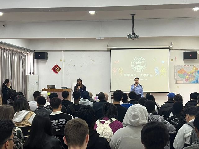 禁毒与交通安全宣讲同步开展。禁毒支队预防教育队队长王妍以“拒绝毒品 共享阳光”为题,结合中外法律体系差异,用真实案例揭示毒品危害,明确“吸毒违法、贩毒犯罪”的法律红线,警示学生勿因文化误解或侥幸心理触碰底线。铜山交管大队副大队长王波与宣传科科长马运川则聚焦中国交通规则,通过实景图片、事故案例,细致讲解校园周边及市区出行安全要点,并在现场发放交通安全宣传彩页,帮助学生直观掌握交通标识、骑行乘车规范、培养文明出行习惯。