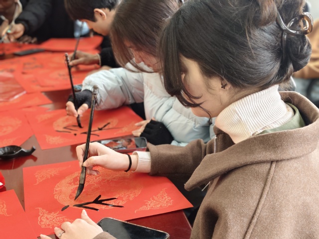 活动紧扣“沉浸式文化体验”主线,设置“翰墨迎春”与“趣味游园”两大互动专区。在墨香氤氲的301室,商校长驻足观看留学生们提笔写“福”、体验年画拓印、巧制毛毡灯笼等,称赞大家“一撇一捺见功底,一拓一印传匠心”。401室内欢声笑语不断,投壶、套圈等传统游戏引得师生竞相参与,美国籍留学生陶海晨表演的舞狮与大洪拳更将现场气氛推向高潮,掌声经久不息。