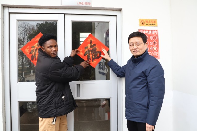 活动尾声,商校长与留学生代表共同在学院门前张贴“福”字。红彤彤的福字映衬着张张笑脸,寓意“福临万家”,也标志着本次慰问活动圆满落幕。未来,国际学院将持续以文化交流为纽带,搭建中外友好沟通的坚实桥梁,引导留学生在“留学苏师”的时光里,既深耕学业、学有所成,更深入体验中国文化、增进对文明的理解,争做中外文明互鉴的积极参与者与推动者,为推动构建人类命运共同体贡献青春力量。
