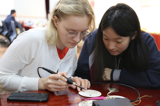活动的最后,附属中学孙孝东老师现场展示和介绍了烙画这一传统技艺。在孙老师的指导下,中学生和外教老师、留学生们结对,共同动手制作了烙画作品。这一环节不仅增进了两校师生之间的友谊,也让大家深刻感受到了中国传统文化的魅力。