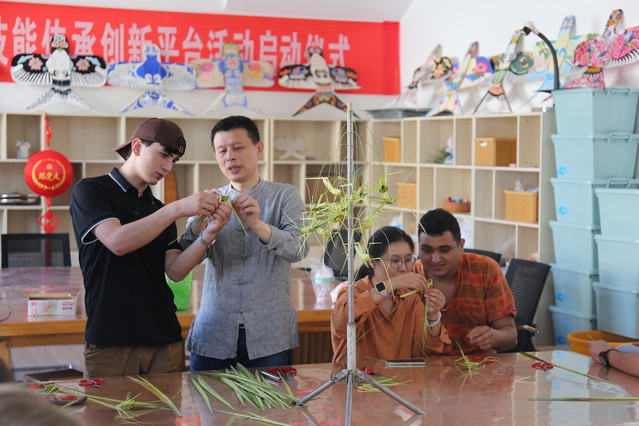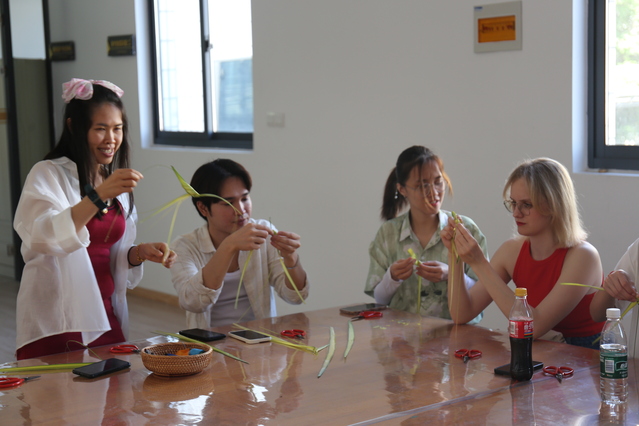 张老师详细讲解并示范了蚂蚱、青蛙、蝴蝶的草编技艺,并在制作过程中渗透中华传统文化知识。活动现场氛围温馨融洽,在轻松愉悦的草编过程中,留学生们不仅了解了草编技艺的历史与发展,也深刻感受到了中国非物质文化遗产的魅力。