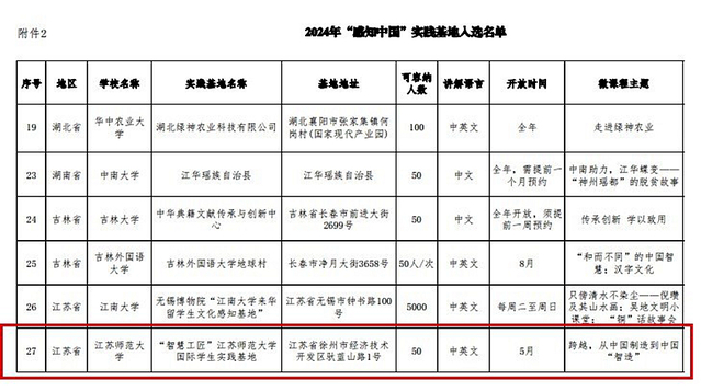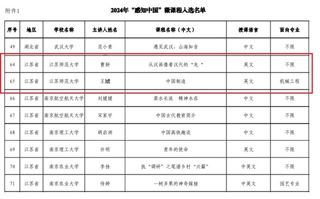 近日,国家留学基金管理委员会公布了2024年“感知中国”微课程与实践基地入选名单,我校国际学院曹妍老师讲授的《从汉画像看汉代的“龙”》、机电学院王虓讲授的《中国制造》两门微课程入选“感知中国”微课程名单,与徐工集团联合申报的“智慧工匠”江苏师范大学国际学生实践基地入选“感知中国”实践基地名单,实现了我校来华留学工作的又一重要突破。
